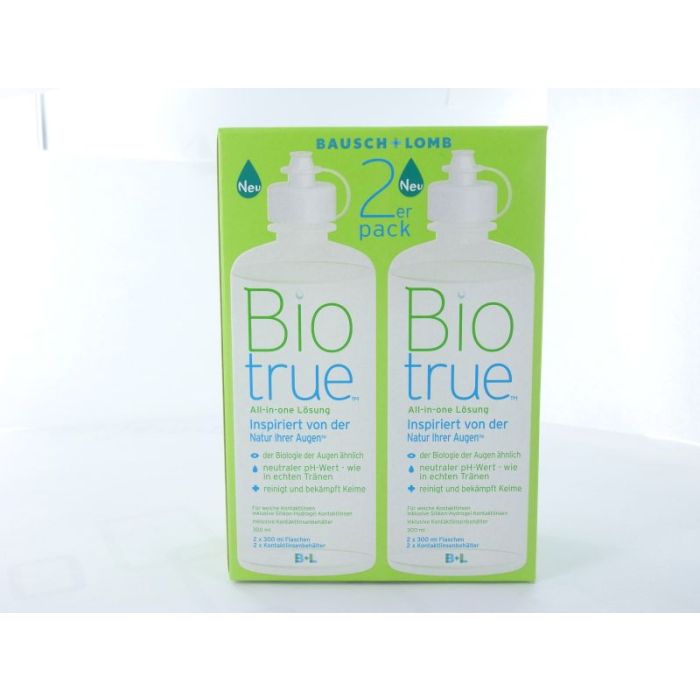Biotrue™ ist eine Kontaktlinsenpflegelösung, bei deren Entwicklung die natürliche Tränenflüssigkeit als Vorbild gedient hat. Ihr ideal auf den natürlichen Tränenfilm abgestimmter pH-Wert von 7,5 führt zu einem angenehmen Gefühl beim Aufsetzen und Tragen der Kontaktlinsen. Biotrue™ nutzt zudem das im Auge selbst befindliche Benetzungsmittel Hyaluronat, was für eine hohe Spontanverträglichkeit sorgt und die Augen vor Feuchtigkeitsverlust schützt. Das Hyaluronat verbleibt bis zu 20 Stunden auf den Kontaktlinsen und trägt so dazu bei, dass der Tragekomfort den ganzen Tag lang anhält. Auch unterstützt Biotrue™ die natürliche antimikrobakterielle Aktivität des Proteins Lysozym im Tränenfilm, was Denaturierung und Ablagerungen auf den Kontaktlinsen vermindert und die Kontaktlinsenoberfläche sauberer hält. Ihre hervorragende Desinfektionswirkung durch ein doppeltes Desinfektionssystem ergänzt die positiven Eigenschaften der All in one Pflegelösung Biotrue™.