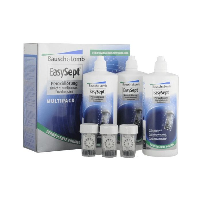 Lieferumfang: 3 Flaschen à 360 ml EasySEPT Einstufen-Peroxidlösung + 3 Kontaktlinsenbehälter